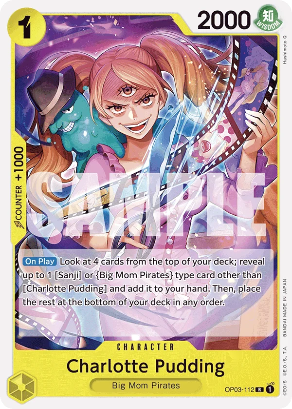 [On Play] Look at 4 cards from the top of your deck; reveal up to 1 [Sanji] or [Big Mom Pirates] type card other than [Charlotte Pudding] and add it to your hand. Then, place the rest at the bottom of your deck in any order.