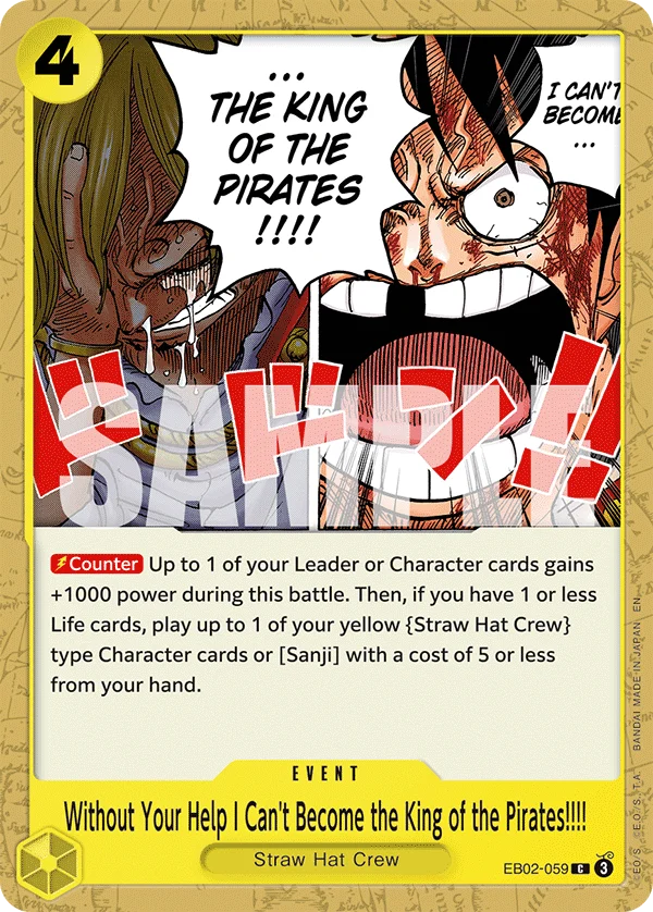 [Counter] Up to 1 of your Leader or Character cards gains +1000 power during this battle. Then, if you have 1 or less Life cards, play up to 1 of your yellow "Straw Hat Crew" type Character cards or [Sanji] with a cost of 5 or less from your hand.