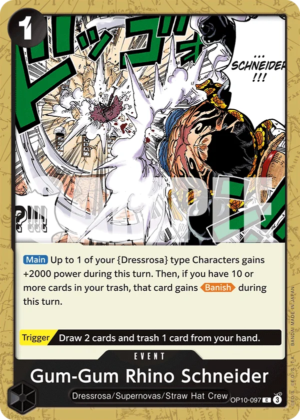 [Main] Up to 1 of your "Dressrosa" type Characters gains +2000 power during this turn. Then, if you have 10 or more cards in your trash, that card gains [Banish] during this turn.