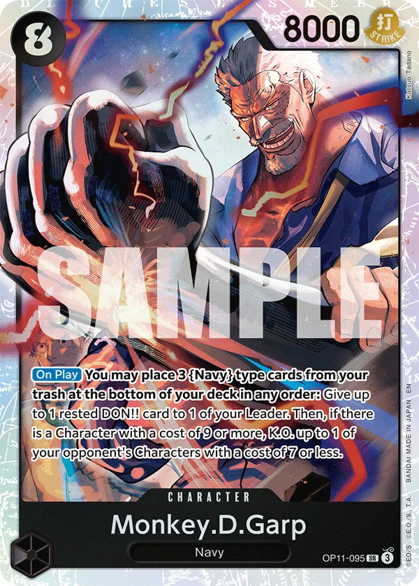 [On Play] You may place 3 "Navy" type cards from your trash at the bottom of your deck in any order: Give up to 1 rested DON!! card to 1 of your Leader. Then, if there is a Character with a cost of 9 or more, K.O. up to 1 of your opponent's Characters with a cost of 7 or less.
