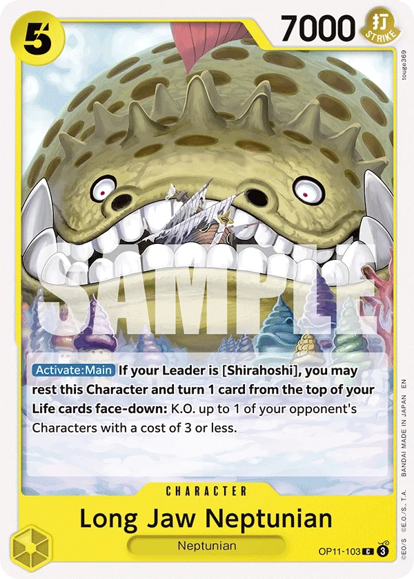 [Activate: Main] If your Leader is [Shirahoshi], you may rest this Character and turn 1 card from the top of your Life cards face-down: K.O. up to 1 of your opponent's Characters with a cost of 3 or less.
