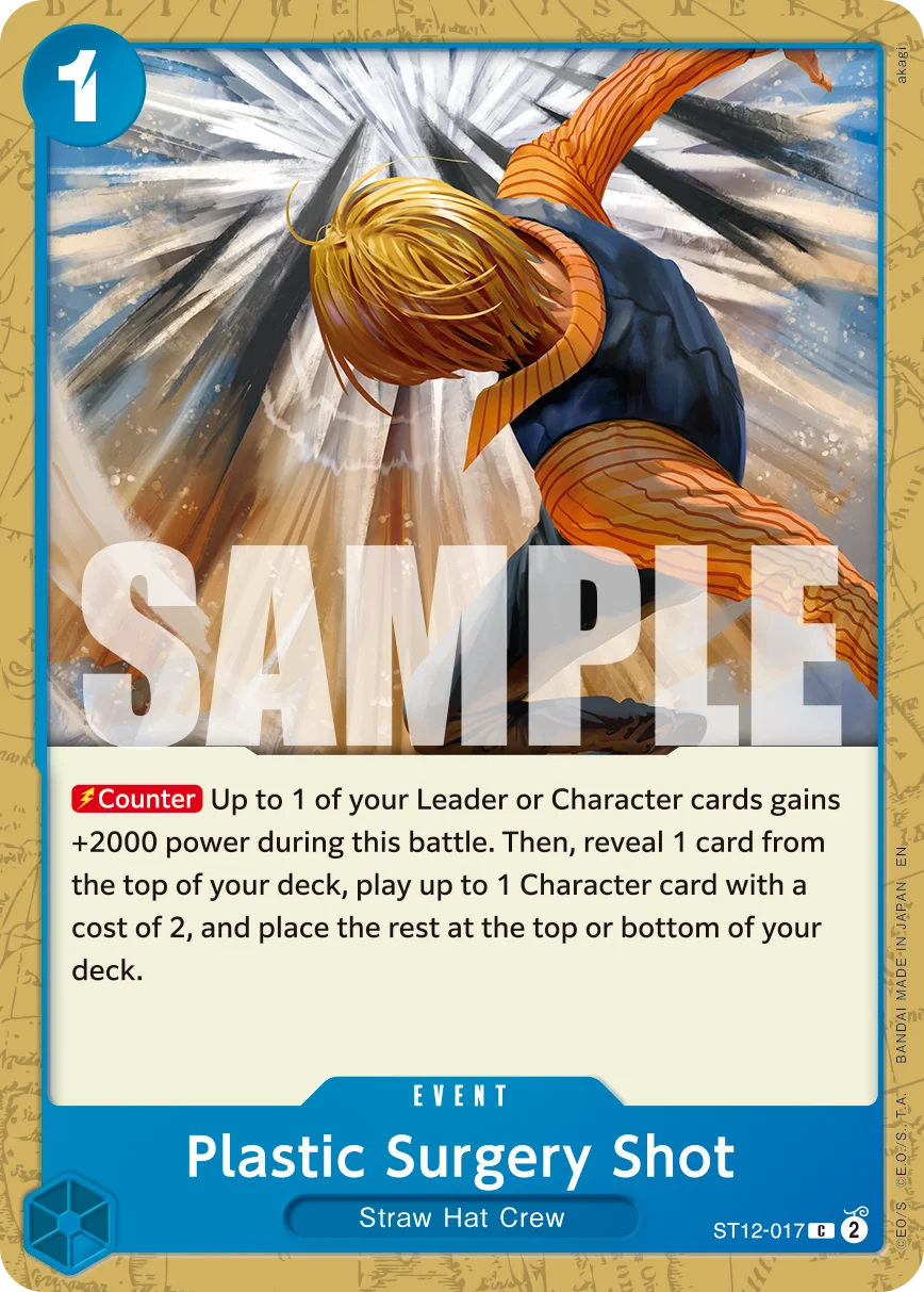 [Counter] Up to 1 of your Leader or Character cards gains +2000 power during this battle. Then, reveal 1 card from the top of your deck, play up to 1 Character card with a cost of 2, and place the rest at the top or bottom of your deck.